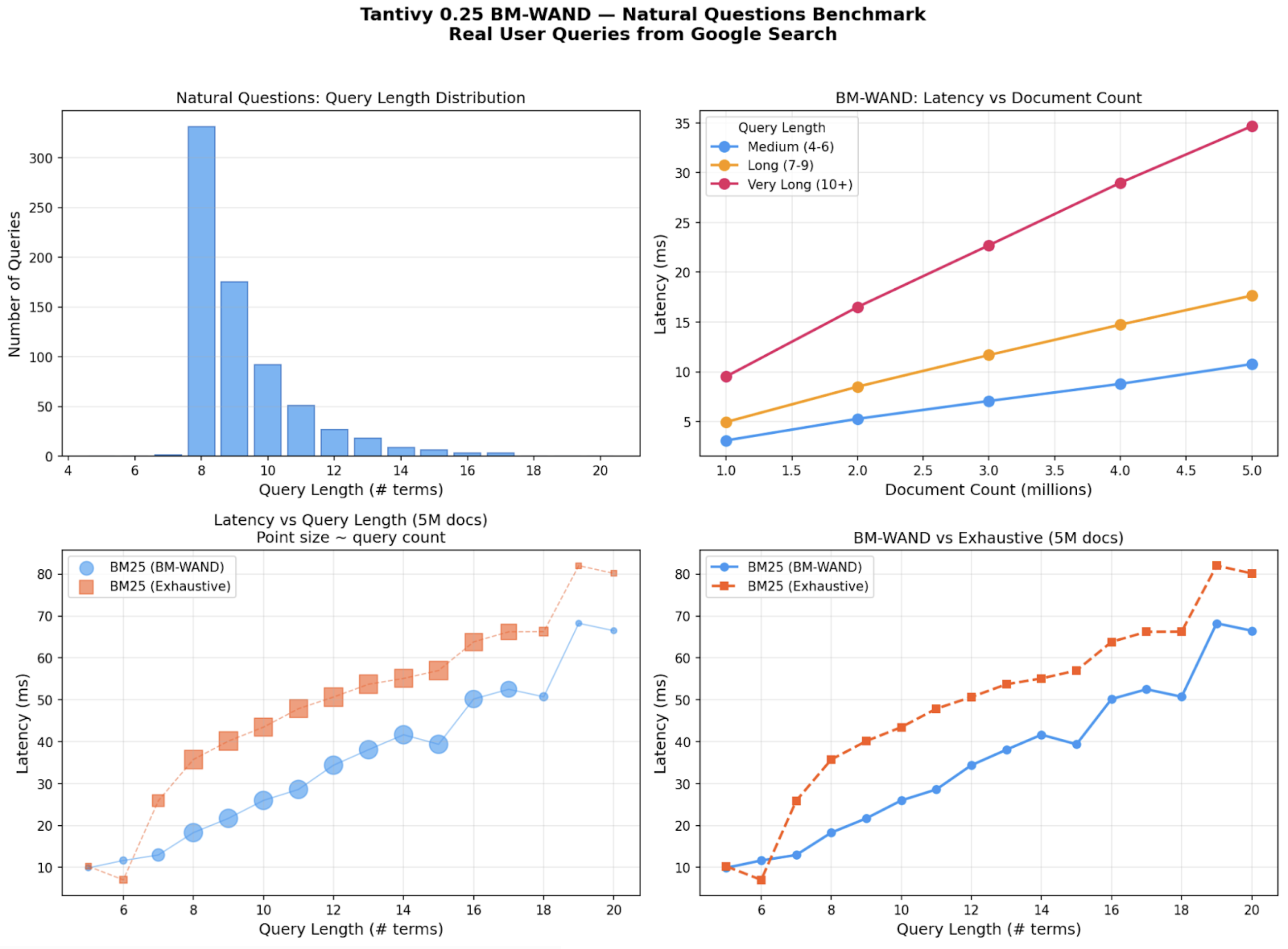 The results are different. With real human queries, BM-WAND performs better than exhaustive search by 1.5-2x across all query lengths. At 8 terms (the most common NQ length), BM-WAND takes 18ms versus 36ms for exhaustive search. The bottom-left chart above shows BM-WAND remains faster than exhaustive across most real query lengths.
