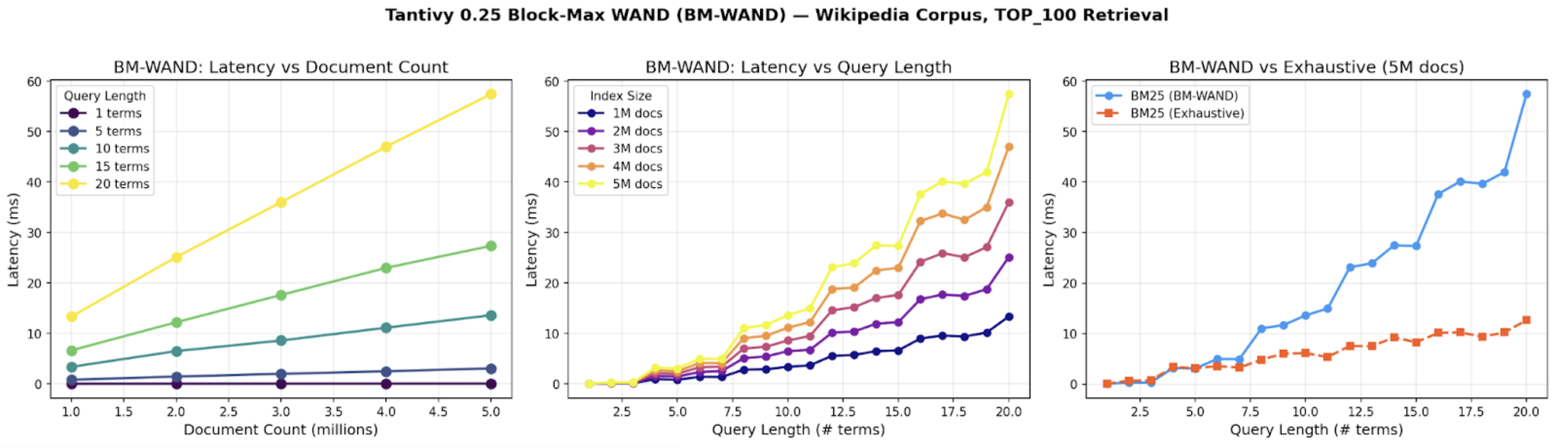 We ran benchmarks on Tantivy 0.25, a well-respected keyword search library written in Rust. Tantivy features SIMD-accelerated posting list operations and a solid Block-Max WAND implementation for top-k retrieval using BM25 scoring by default. Using Wikipedia articles from the search-benchmark-game corpus, we varied both document count (1M to 5M) and query length (1 to 20 terms). Queries were constructed by randomly sampling terms from the index vocabulary